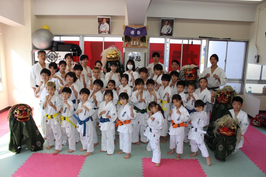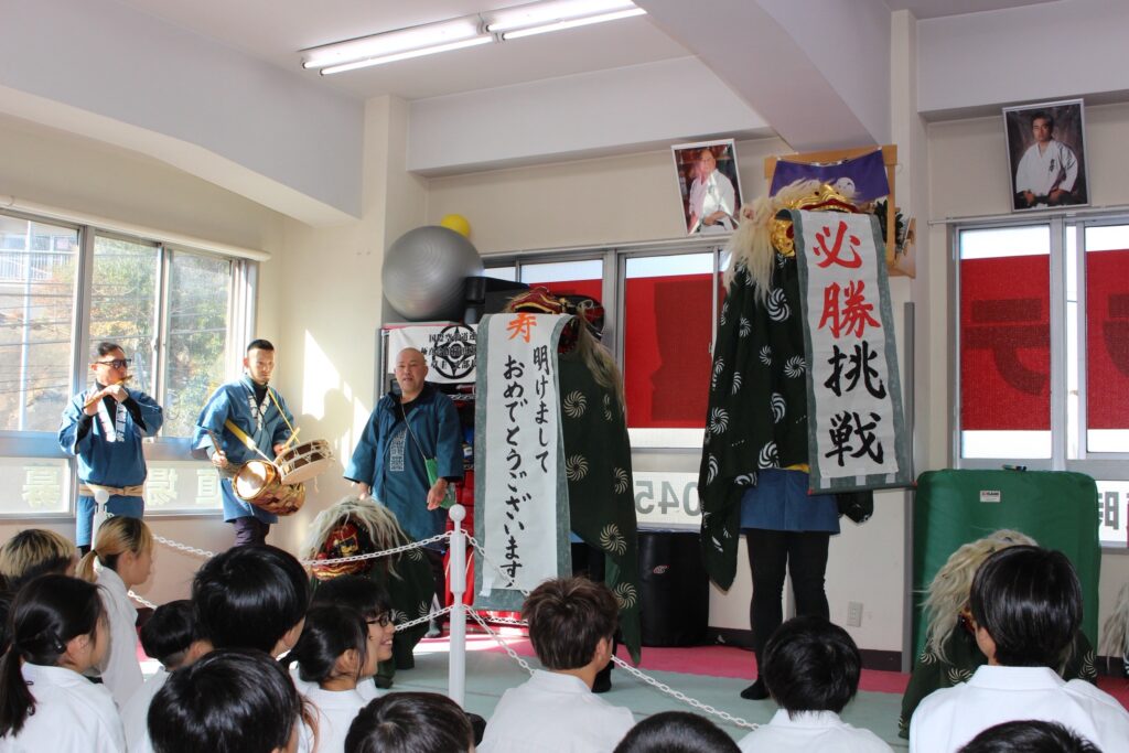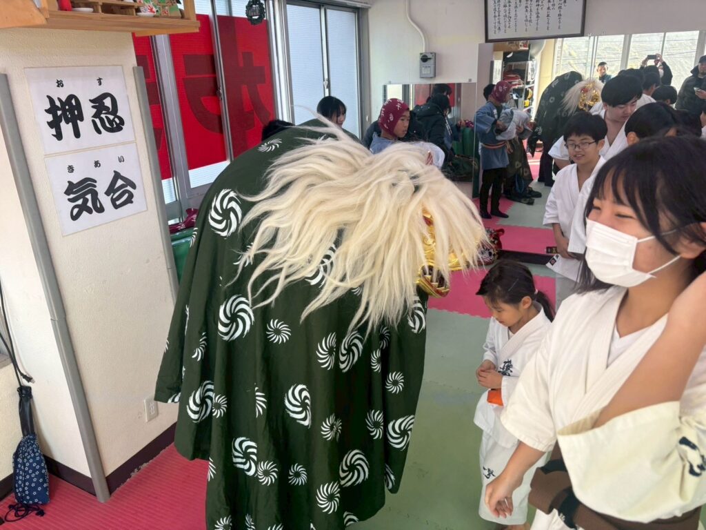 道場へ戻り、道場生とその仲間たちが囃子を披露して貰い、獅子舞まで来てくれて大変盛り上がりました。